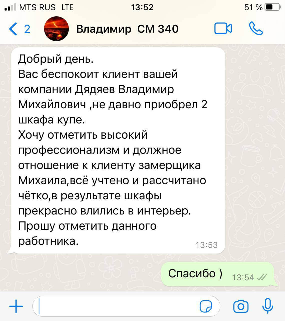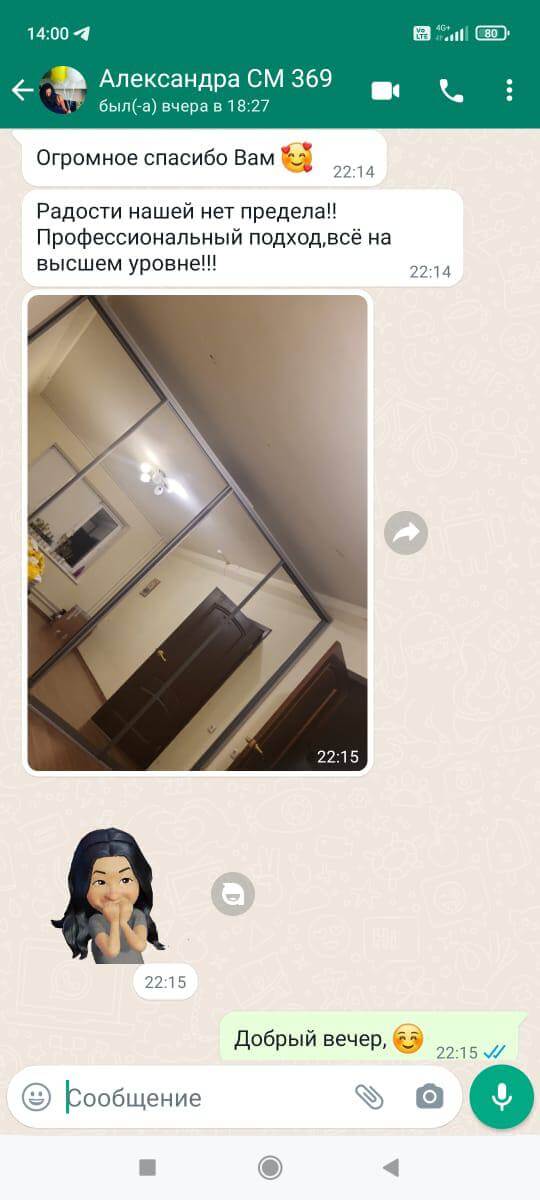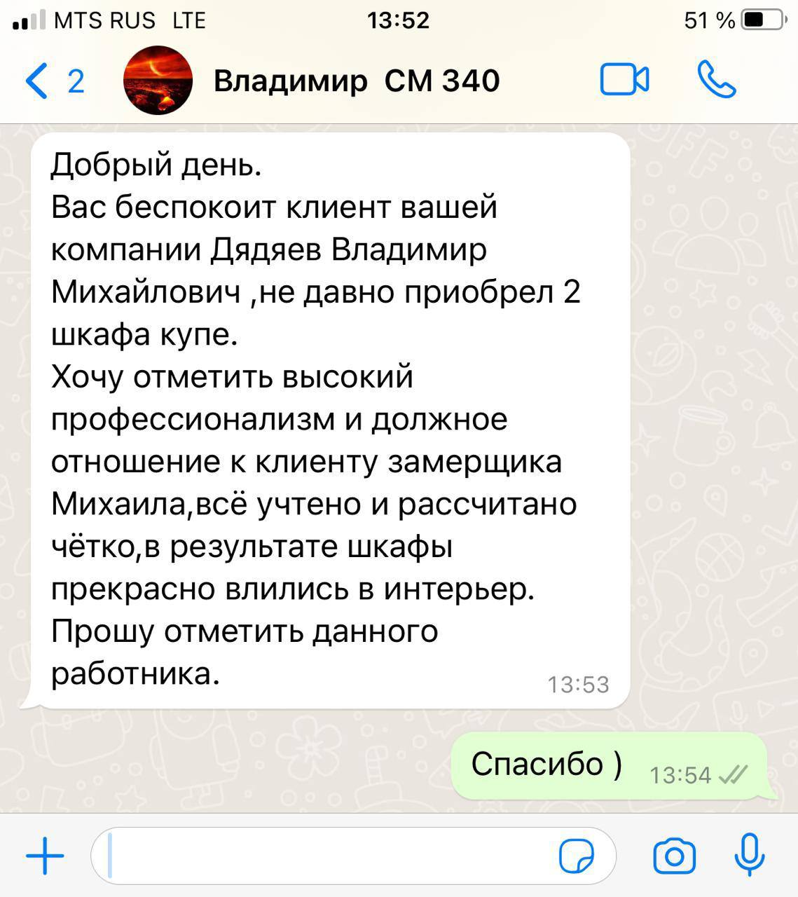 Спасибо большое за шкаф, третий день как собрали, а такое ощущение, что всегда там стоял!!! Шкаф идеально занял пространство, стало от него даже как-то светлее в комнате. Спасибо Дмитрию за профессионализм, все замерил, учёл все предпочтения по наполнению шкафа, дал советы по более лучшему распределению блоков. Ребята, которые собирали сделали все чисто и достаточно тихо. Мы очень довольны, что выбрали Вашу компанию! Желаем дальнейшего процветания и прекрасных работ!!