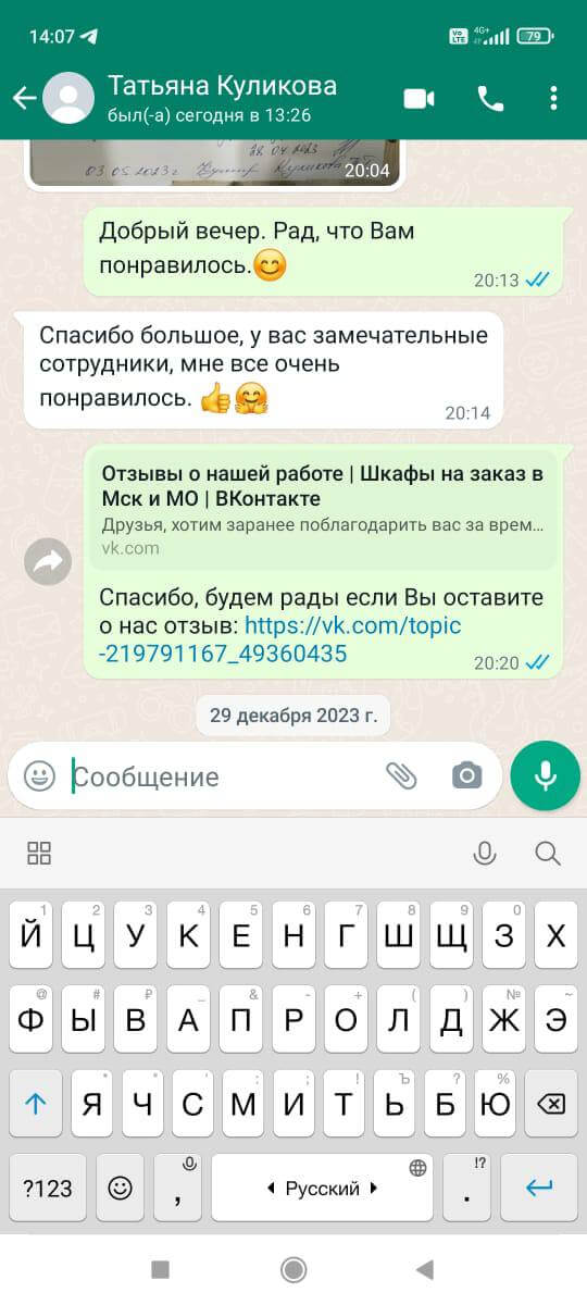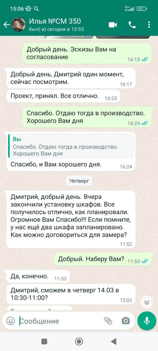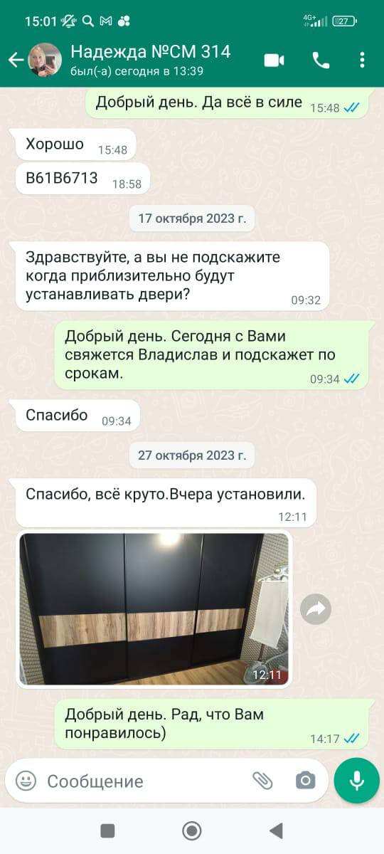 Спасибо замерщику Дмитрию и установщику Саше огромное! Изготовили в срок и установили качественно с учётом всех моих пожеланий согласно проекта. Боялся, что не угадаю с черным цветом под дерево. Сложно ориентироваться по образцу. Но это просто бомба товарищи я Вам доложу. Цена приятная. Везде впаривали дороже. Тем более скидка на второй заказ. Уже есть предварительный вариант гардеробной. Додумываю и собираюсь заказывать)
